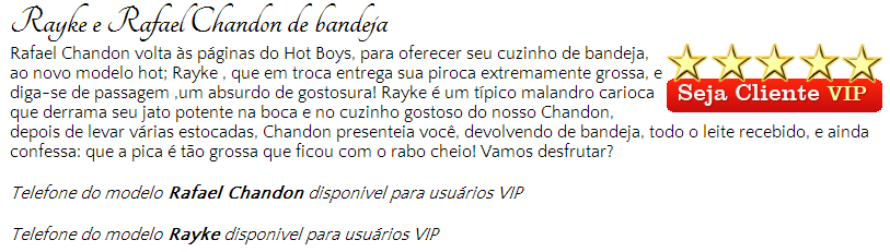 A gente quer foda, e sabe que foda gostosa mesmo, é aquela que rola entre dois brasileiros bem sacanas e torados. É o caso deste produto que o parceirasso site Hotboys envia pra gente, direto das suas produções. Chandon é prata da casa, e manda ver já em outros ensaios pro site, que são de arrasar. A novidade é o Rayke, carioca gostoso, com cara de malandro, pica sem noção e muita disposição pra meter. Leia a sinopse do site e diz de não de arrasar?